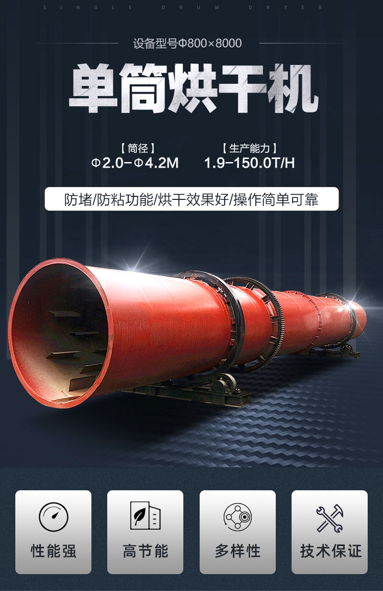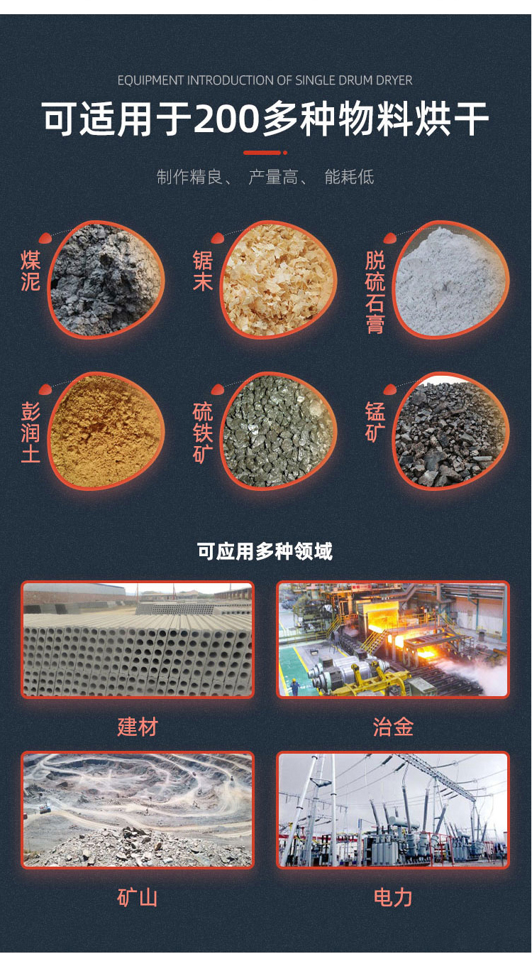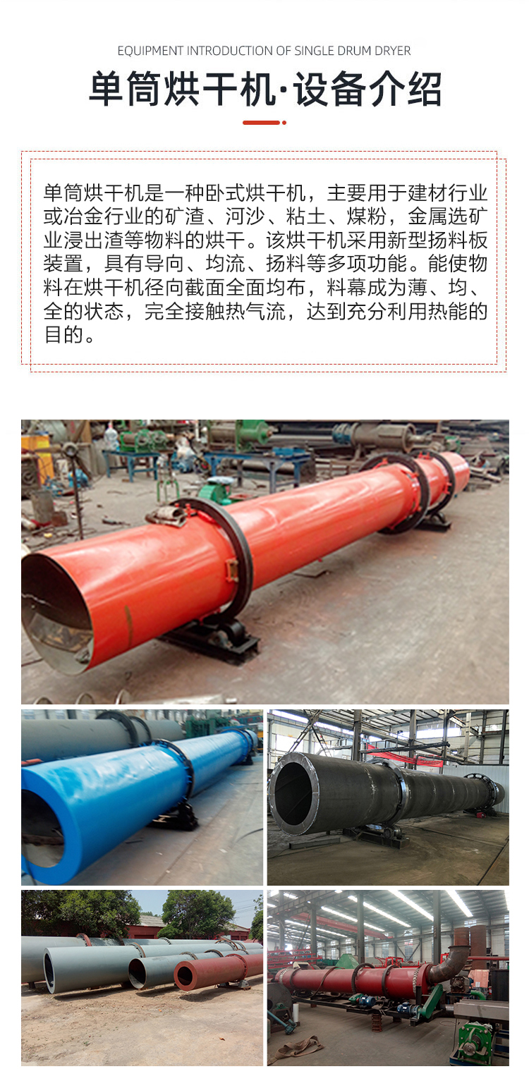 單筒烘干機系統是由熱源、打散裝置、帶式上料機、進料機、回轉滾筒、帶式出料機、引風機、卸料器和配電柜構成的新型專用干燥設備,可廣泛應用于煤泥、原煤、浮選精煤、混合精煤等煤炭行業物料的干燥;高爐礦渣、粘土、澎潤土、石灰石、沙子、石英石等建筑行業物料的干燥;各種金屬精礦、廢渣、尾礦等選礦行業物料的干燥;以及化工行業非熱敏性物料的干燥。