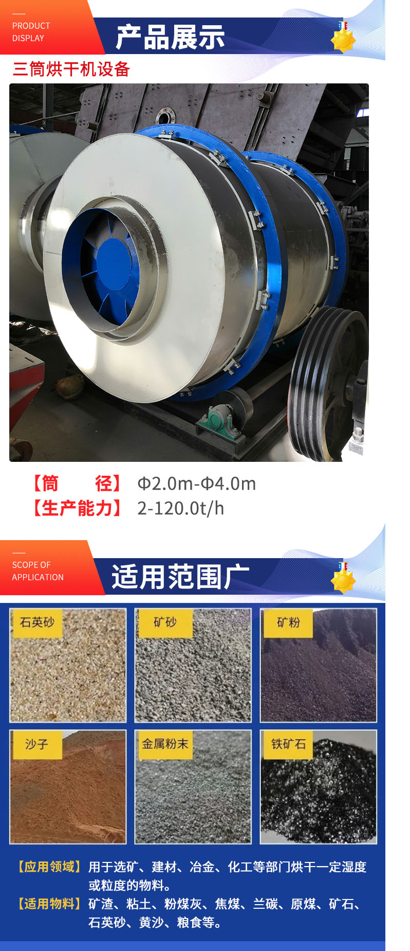 三筒式烘干機具有結構緊湊、構造簡單、布局合理,提高物料與熱能的熱交換率,使物料烘干效果好;基礎投入少,僅是相同產量單筒烘干機的二分之一,減少了一次性投入;運行可靠、能耗低、熱效率高;同時,容易實現自動化控制,減少操作人員,節約勞動力資源。