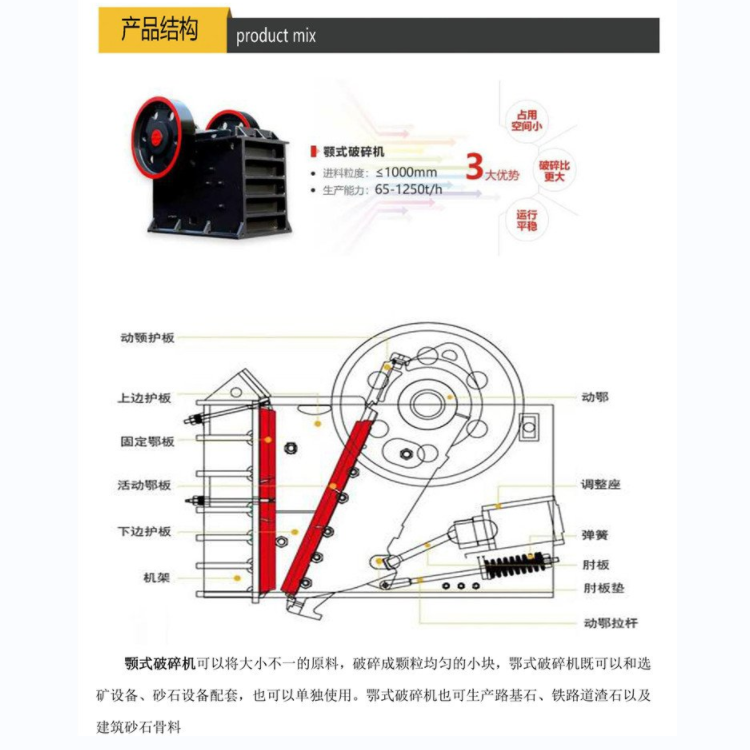顎式破碎機(jī)是出現(xiàn)較早的破碎設(shè)備,因其構(gòu)造簡單、堅固、工作可靠、維護(hù)和檢修容易以及生產(chǎn)和建設(shè)費用比較少,因此,直到現(xiàn)在仍然廣泛地在冶金、化工、建材、電力、交通等工業(yè)部門,用于破碎抗壓強(qiáng)度在147~245MPa的各種礦石和巖石的粗、中、細(xì)碎。